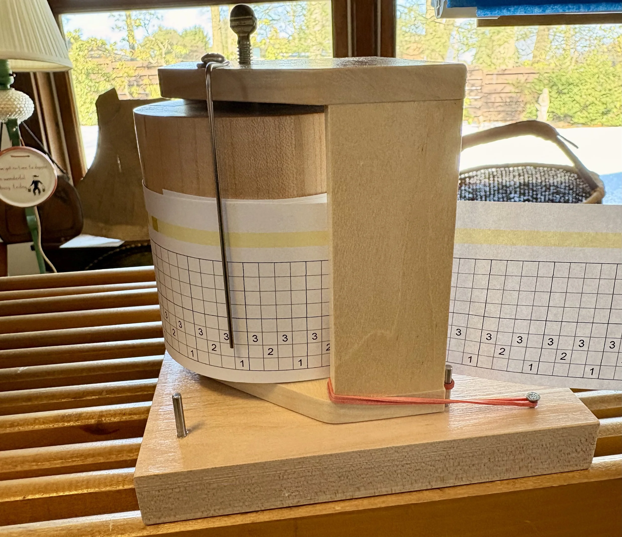 To control this long strip of paper, I wrap the other end of the paper draft around the ball winder and attach this tool, upside down, to the castle of my loom. As I thread, I rotate the cylinder so that the vertical pointer marks the next thread. The paper draft easily unwinds from the ball winder, as I rotate the cylinder of the Weaver’s Perfect Memory.